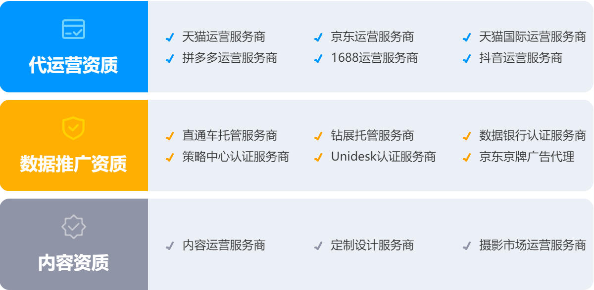 阿裏、京東等平台官方認證星級服務商,擁有完善的質量管理體係,讓服務流程標準化、規範